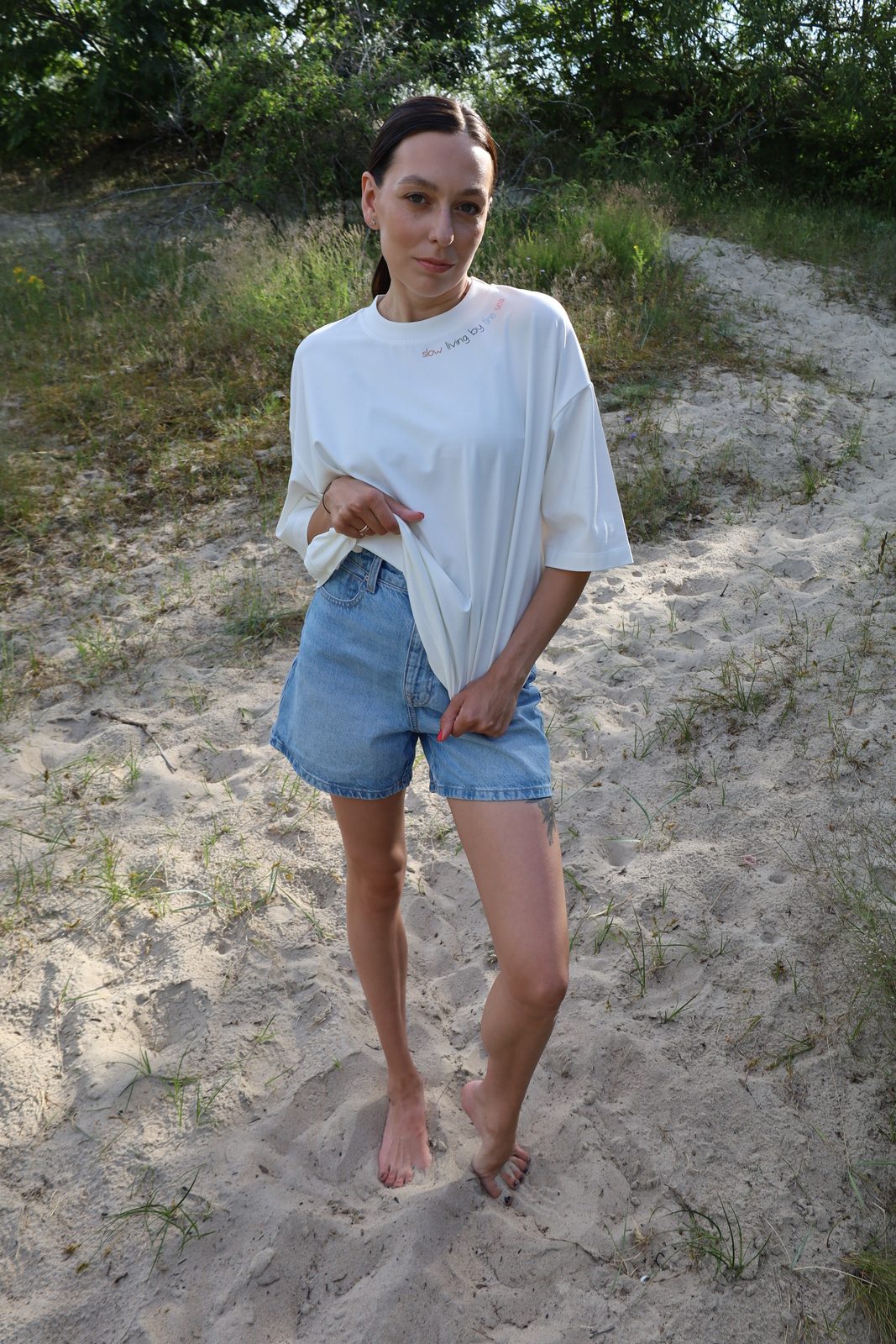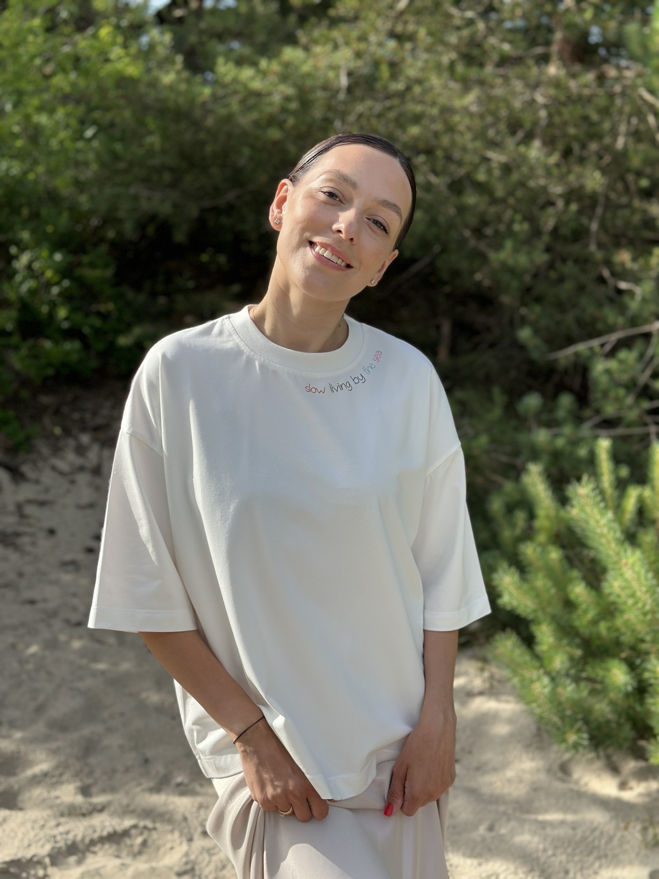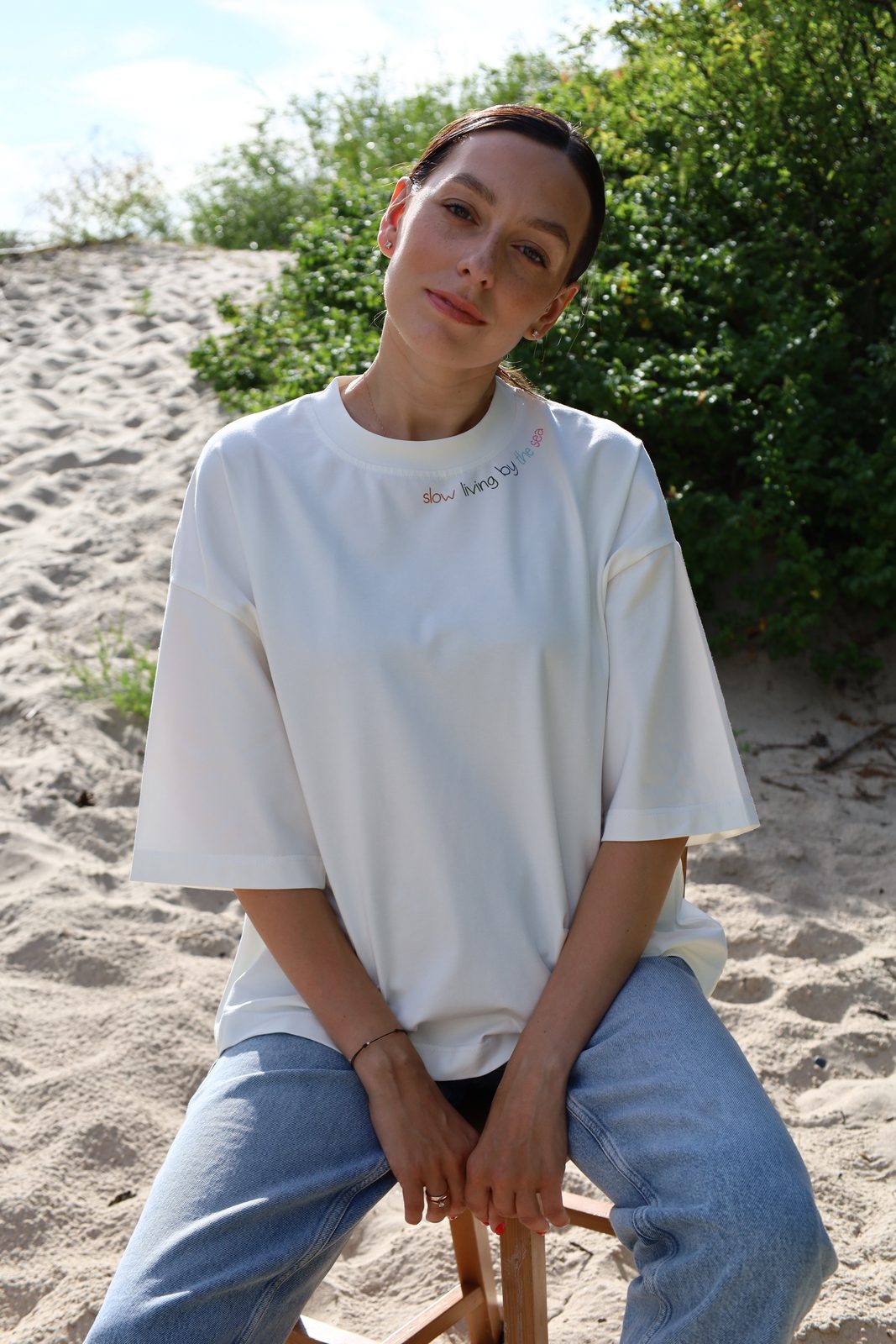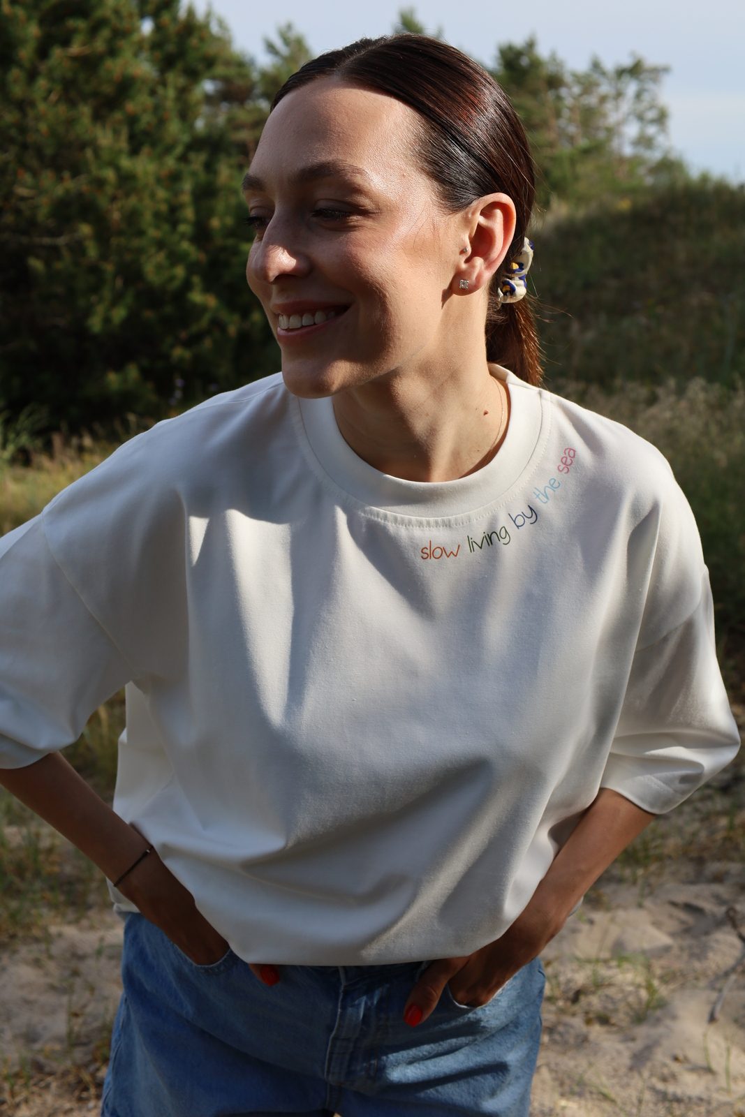 Pieno baltumo marškinėliai su Slow living by the sea užrašu.