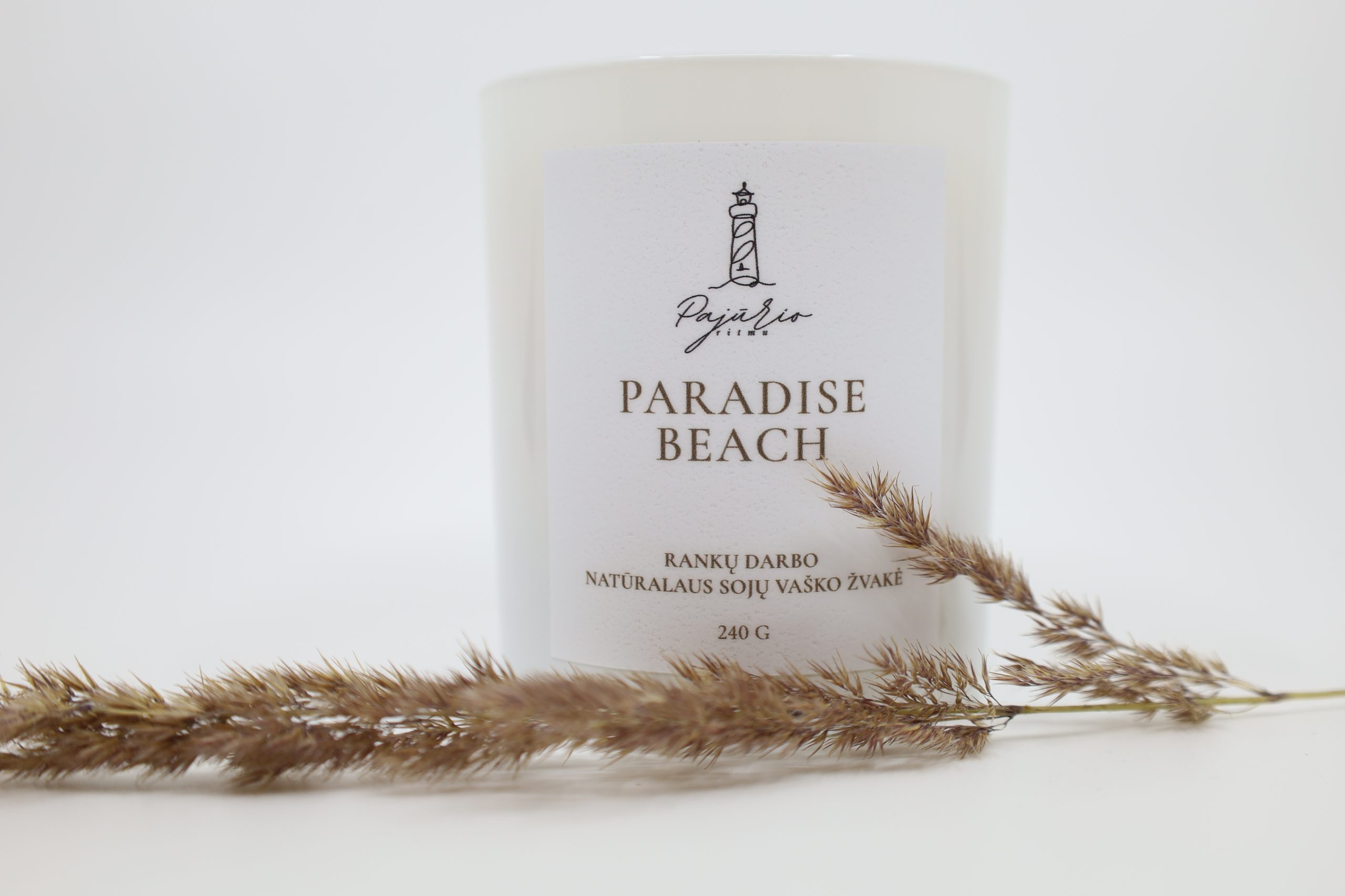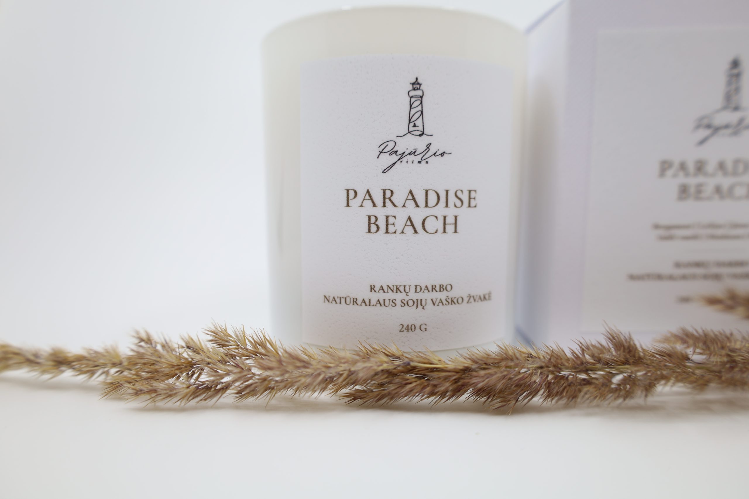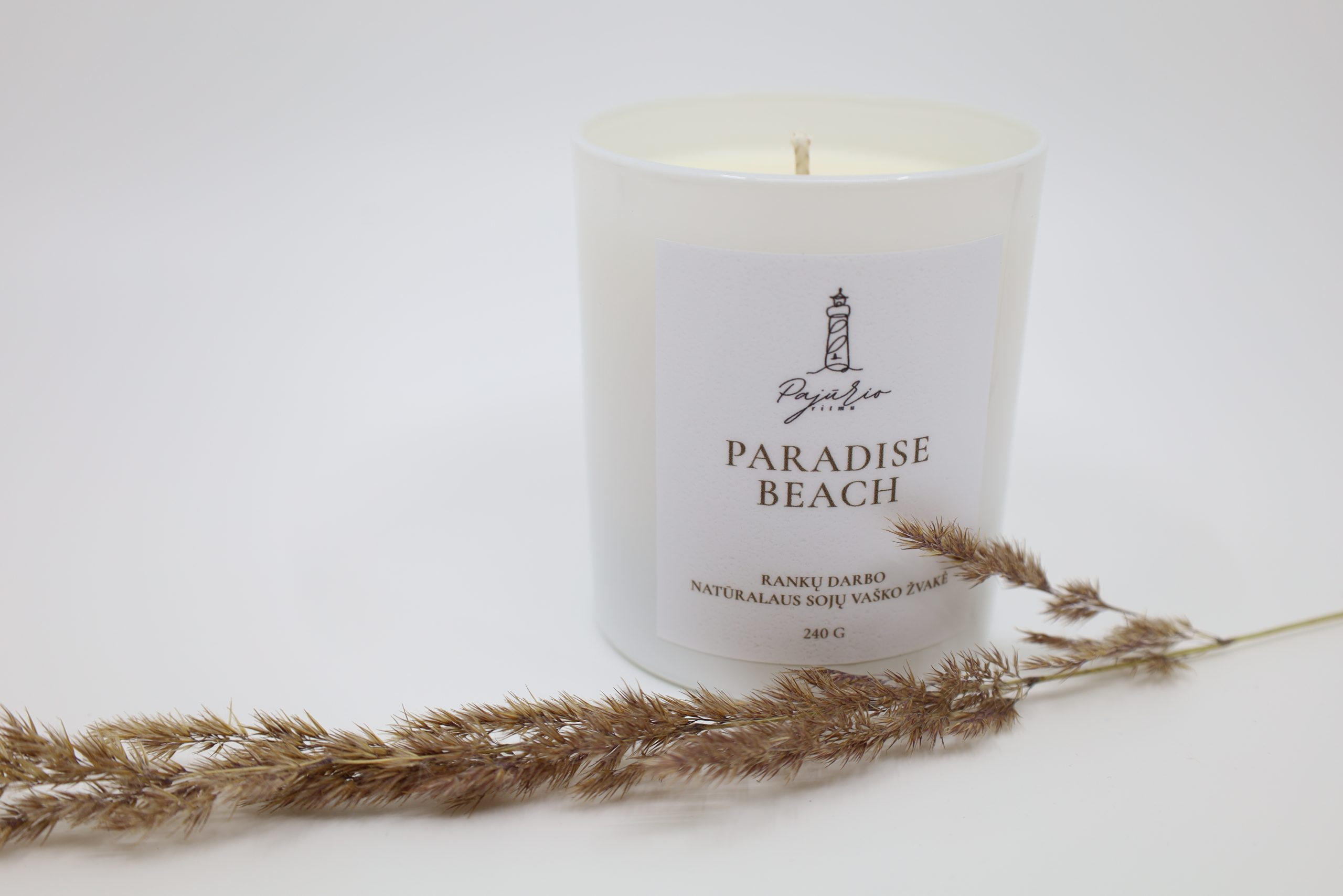 Rankų darbo žvakė, pagaminta Lietuvoje. 240 g., dega iki 45 valandų. Natūrali ir estetiška – tai ko reikia Jūsų namams. Nėra jokių priemaišų, tik sojų vaškas. Paradise beach aromato natos: bergamotė, lelijos ir jūros vanduo, saldi vanilė, muskusas, kokosai. Daugiasluoksnė kompozicija susijungia ir sukuria nepakartojamą aromato patirtį. Dagtis – natūrali, medvilninė, kad lengviau užsidegtų yra vaškuota. Todėl uždegama greitai ir patogiai. Jauki liepsna ir aromatas padeda atsipalaiduoti, sukuria malonią atmosferą. Viršutinės natos: bergamotė, užuodžiamos pirmiausiai, sukelia pirminį įspūdį ir turi didžiausią poveikį. Vidurinės natos: lelijos ir jūros vandens, atsiskleidžia viršutinėms natoms blėstant ir išlieka visą laiką, šios kvapų natos sudaro apie 70 procentų visos kvapo kompozicijos. Pagrindinės natos: saldi vanilė, muskusas ir kokosai sudaro kvapo pagrindį, yra labai sodrios ir ilgai išliekančios. Jauki liepsna ir aromatas padės atsipalaiduoti, sukurti malonią atmosferą. Tai puiki interjero detalė ar jaukus šventės dekoras. Žvakė įpakuota popierinėje dovanų dėžutėje, todėl tai gali būti dovana ne tik sau, bet ir artimiesiems.