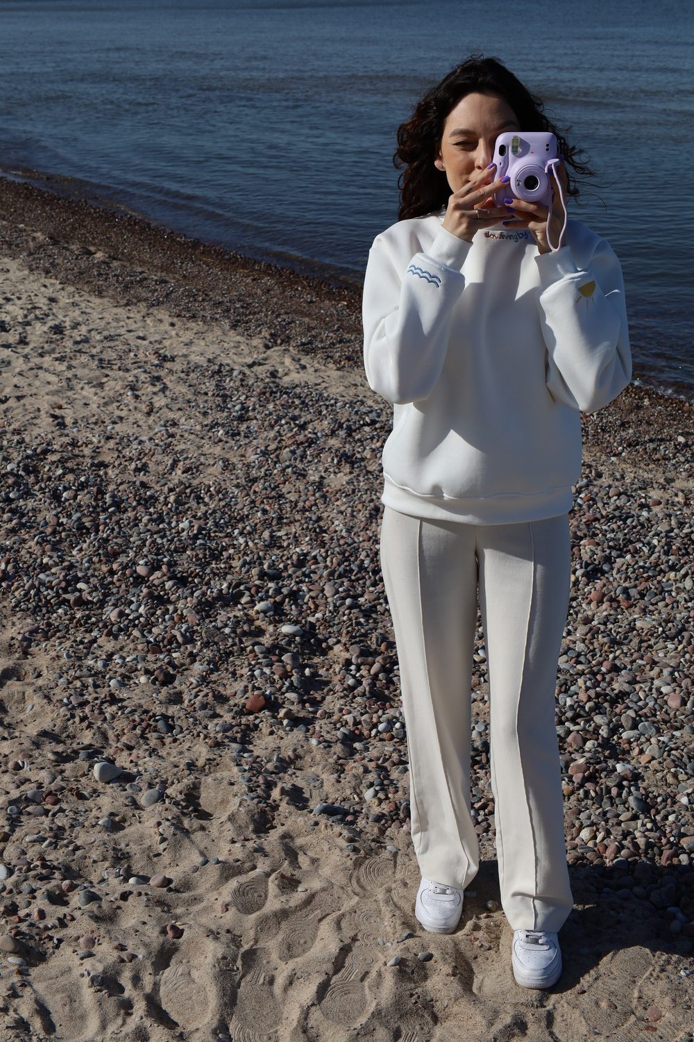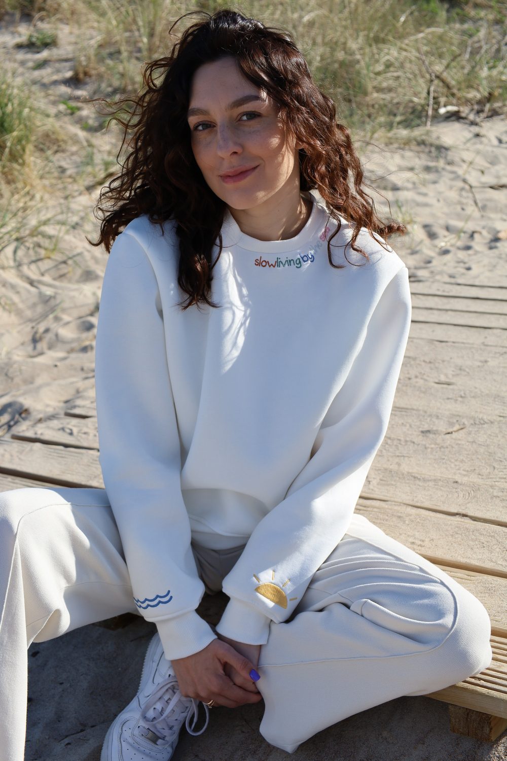 Tamprus ribo audinys rankogaliuose, apykaklės srityje ir džemperio apačioje. Taip pat spalvotais siūlais išsiuvinėtas užrašas SLOW LIVING BY THE SEA (lėtas gyvenimas prie jūros) ir rankovių apačiose akį traukiančios detalės SAULĖ ir BANGOS.